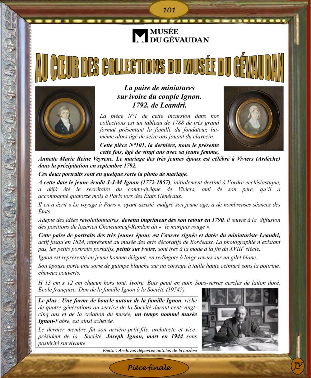Trésors du Musée (Nos collections) 101 – La paire de miniatures sur ivoire du couple Ignon, 1792 de Léandri – Dernière pièce présentée La pièce n°101 de cette incursion dans nos collections est un tableau de 1788 Vous aimerez peut-être également 52 – Le collier de chien clouté contre les loups, XIXe siècle 32 – Le cippe d’Ispagnac, IIe siècle ap. J.-C. 73 – Les Armoires, Victorin Galière, 1984