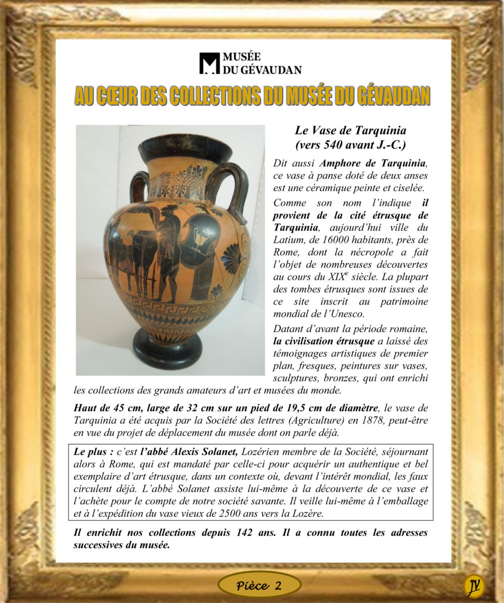 Trésors du Musée (Nos collections) 2 – Le vase de Tarquinia (vers 540 avant J.-C.) Dit aussi amphore de Tarquinia, ce vase à panse … Vous aimerez peut-être également 51 – Ornement de bronze de la ceinture du tumulus du Falisson, 1 000 ans avt. J.-C. 23 – Portrait officiel de S.M. Louis Philippe 1er roi des Français, 1840 ? 34 – L’Arrivée des moissonneurs dans les marais pontins, 1831(original)
