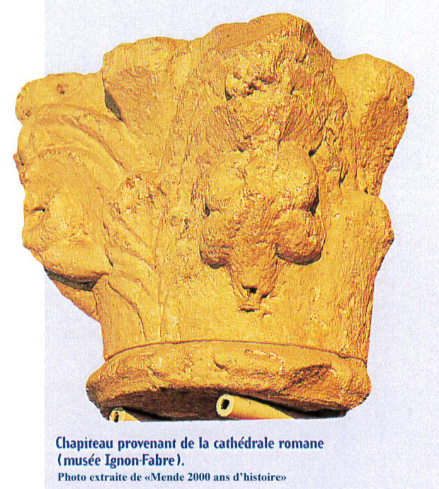 Vous pouvez contempler en pièce 35, un élément de la cathédrale édifiée à partir de la fin du XIVème siècle. Celui que vous pouvez découvrir sous le n°61 est beaucoup plus ancien. Il s’agit d’une pièce du mobilier intérieur qui date non pas de la précédente, la cathédrale romane, dont vous pouvez voir, ci-contre, un chapiteau conservé dans les réserves du musée, mais de celle encore antérieure, c’est à dire de la période préromane de l’évêque Étienne (milieu du Xe siècle), détruite par un incendie vers 1100.