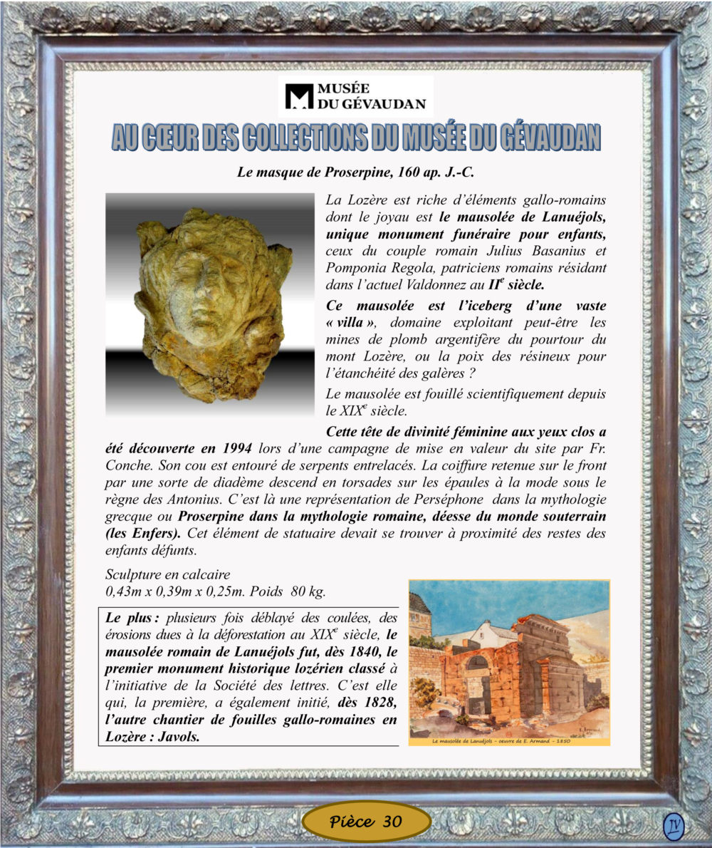Trésors du Musée (Nos collections) 30 – Le masque de Proserpine, 160 après J.-C. La Lozère est riche d’éléments gallo-romains dont le joyau est … Vous aimerez peut-être également 47 – Portrait du Dr. Maurice Bourrillon, 1896, par Jeanne Tournay 55 – La chimère du corbeau de la cathérale, XVe siècle 21 – L’atelier au fauteuil bleu, 1975, Victorin Galière (1914 – 1990)