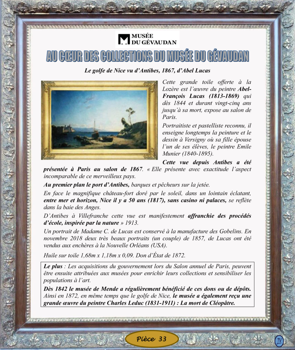 Trésors du Musée (Nos collections) 33 – Le golfe de Nice vu d’Antibes, d’Abel Lucas, 1867 Cette grande toile offerte à la Lozère est l’œuvre du peintre Vous aimerez peut-être également 46 – Portrait de Jeanne Tournay, 1897, par Mathilde Delattre 13 – L’évêque Guillaume Durand V -(1230-1296) 81 – Les deux plastrons d’armure et cabassets, vers 1580