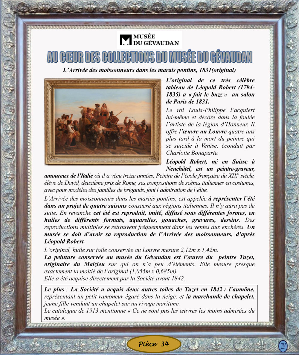 Trésors du Musée (Nos collections) 34 – L’Arrivée des moissonneurs dans les marais pontins, 1831(original) L’original de ce très célèbre tableau de Léopold Robert (1794-1835) Vous aimerez peut-être également 29 – Le portrait du comte Philibert d’Apchier, assassiné dans la cathédrale en 1605 23 – Portrait officiel de S.M. Louis Philippe 1er roi des Français, 1840 ? 1 – Le salon de musique