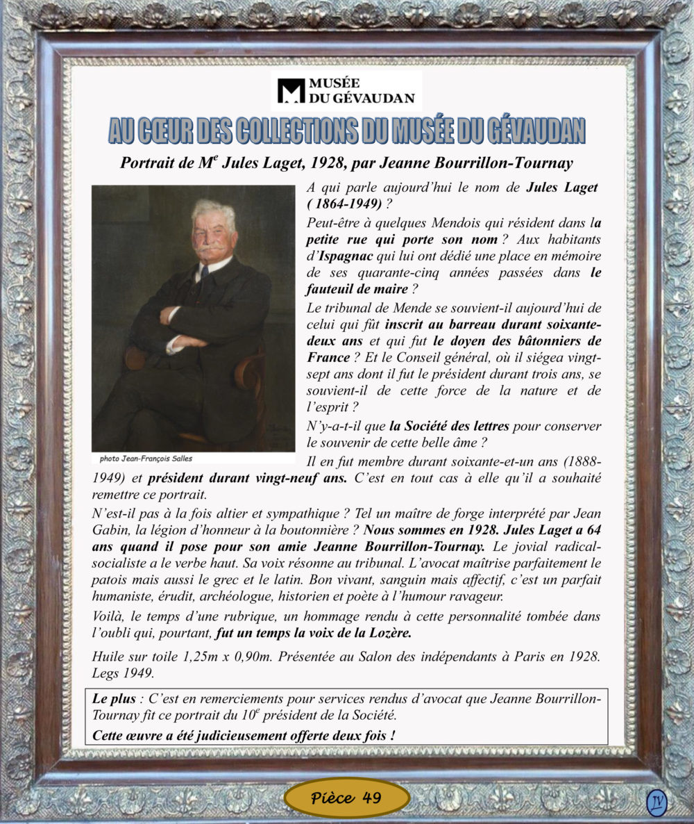 Trésors du Musée (Nos collections) 49 – Portrait de Maître Jules Laget, 1928, par Janne Bourrillon-Tournay A qui parle aujourd’hui le nom de Jules Laget (1864-1949) ? Vous aimerez peut-être également 56 – La bouche d’eau de Mende en bronze, XVIIe siècle 17 – La statue-menhirs des remparts de Mende, 3000 ans av. J.-C. 20 – Le canon de bois de Charrier, 1793