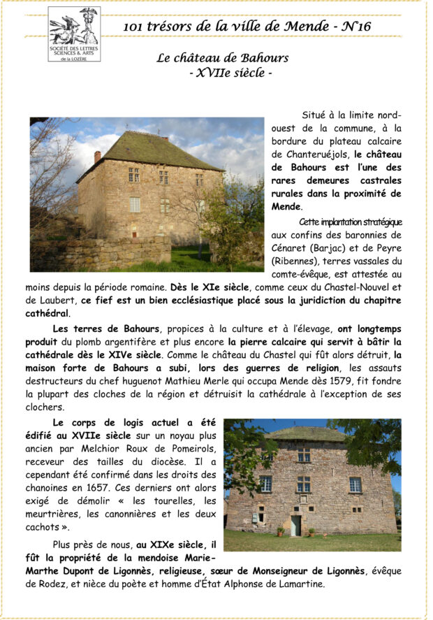 Trésors de Mende Pièce 16 – Le château de Bahours Vous aimerez peut-être également Pièce 58 – La fontaine de la Mendozère Pièce 10 – Le lavoir de la Calquière Pièce 68 – La croix neuve et la croix de la mission