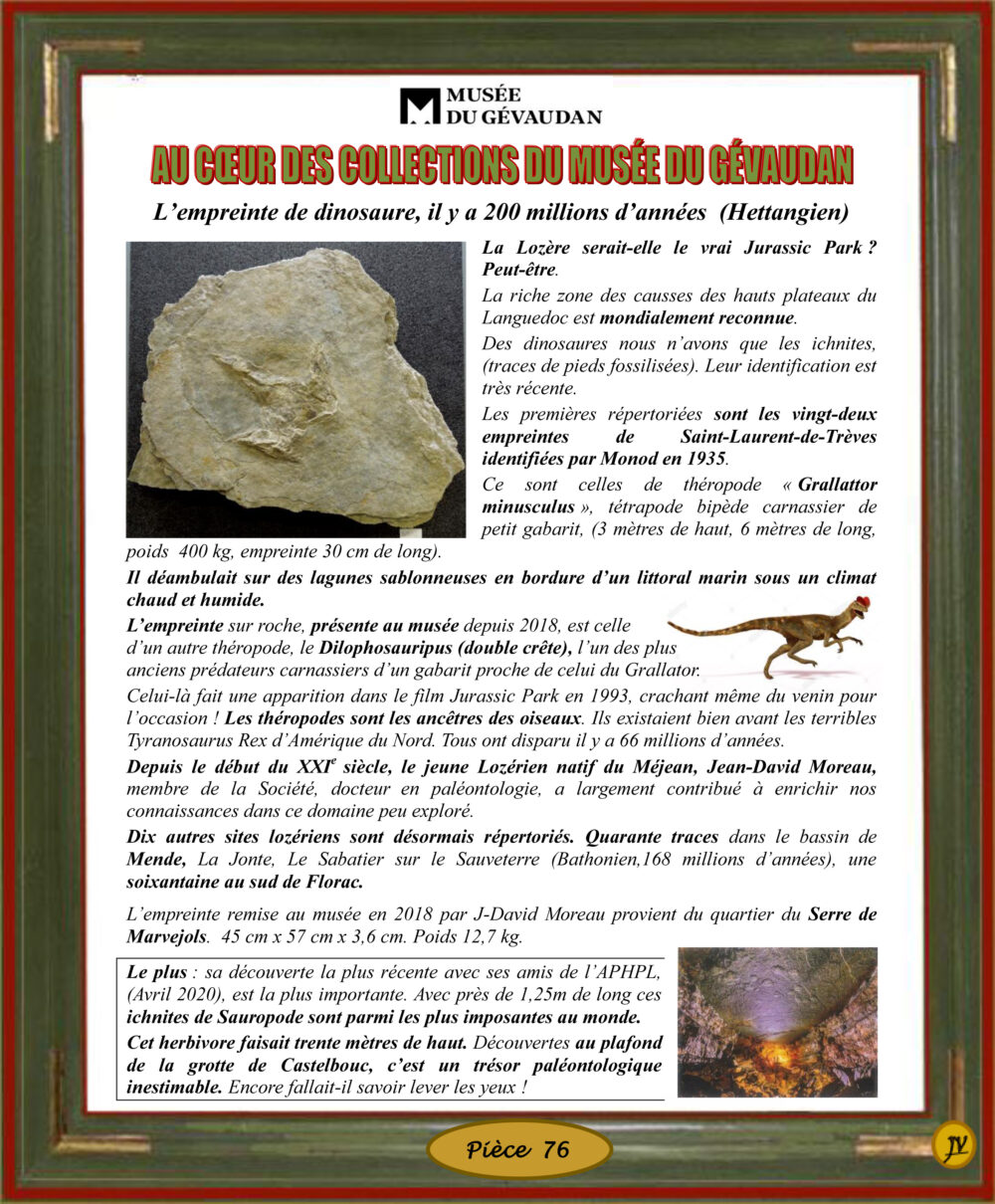 Trésors du Musée (Nos collections) 76 – L’empreinte de dinosaure, il y a 200 millions d’années -Hettangien) La Lozère serait elle le vrai Jurassic Park, peut-être ! Vous aimerez peut-être également 34 – L’Arrivée des moissonneurs dans les marais pontins, 1831(original) 50 – Portrait de Paulin Daudé, 1927, par Jeanne Bourrillon-Tournay 65 – Le chapiteau roman de Sainte Enimie, XIIème siècle