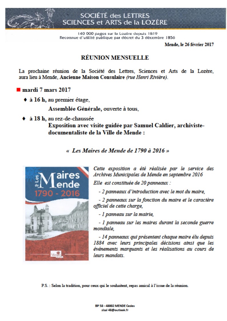 Récemment 7 mars 2017 – Les maires de Mende de 1790 à 2016 Voici l’annonce : Vous aimerez peut-être également 14 décembre 2021 – « Georges Brassens poète musicien … à moins que ce soit l’inverse ? » 9 janvier 2018 – Conférence « Hommage à Gérard Ménatory (1921-1998) » par Michel Chalvet 11 août 2020 – Du cacao au thé d’Aubrac