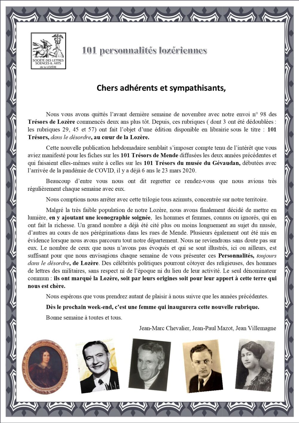 Personnalités de Lozère Avant-propos du 27 févier 2026 Vous aimerez peut-être également Louis Dalle (1922-1982) Gérard MENATORY (1921-1998) Marie Sophie de LAMARTINE (1802-1863)