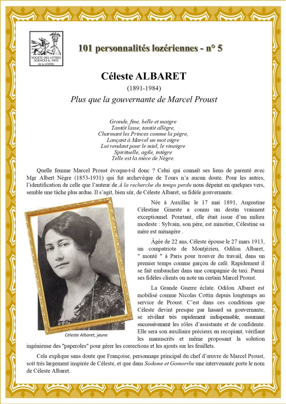 Personnalités de Lozère Céleste Albaret (1891-1984) Vous aimerez peut-être également Gérard MENATORY (1921-1998) Jean VAISSADE (1911-1979) Les personnalités de Lozère