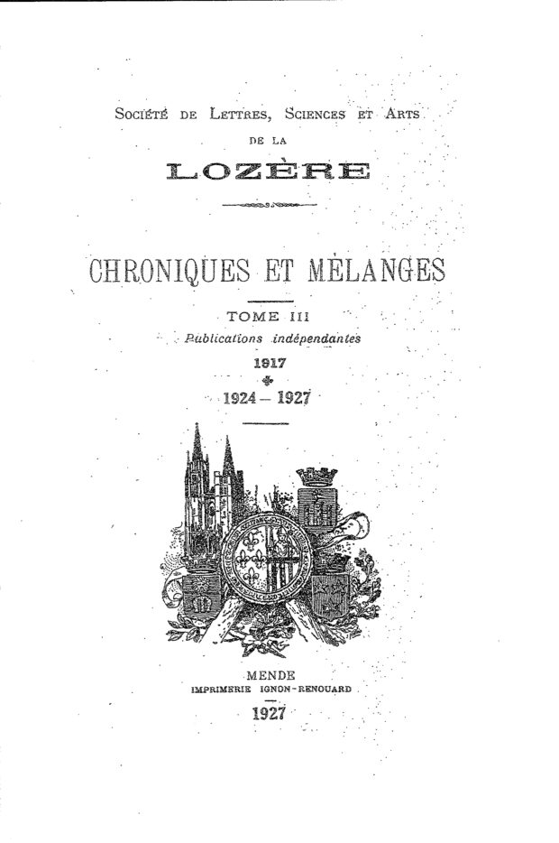 Publications anciennes Chroniques et Mélanges – Tome III (1917, 1924-1927) Publications indépendantes 1917 Anciennement tome IV 1924 1925 1926 1927 Ouvrage de 500 pages indissociable des quatre autres tomes. Vous aimerez peut-être également Le village aux trois ponts Le Valdonnez et ses abords Le château du Solier