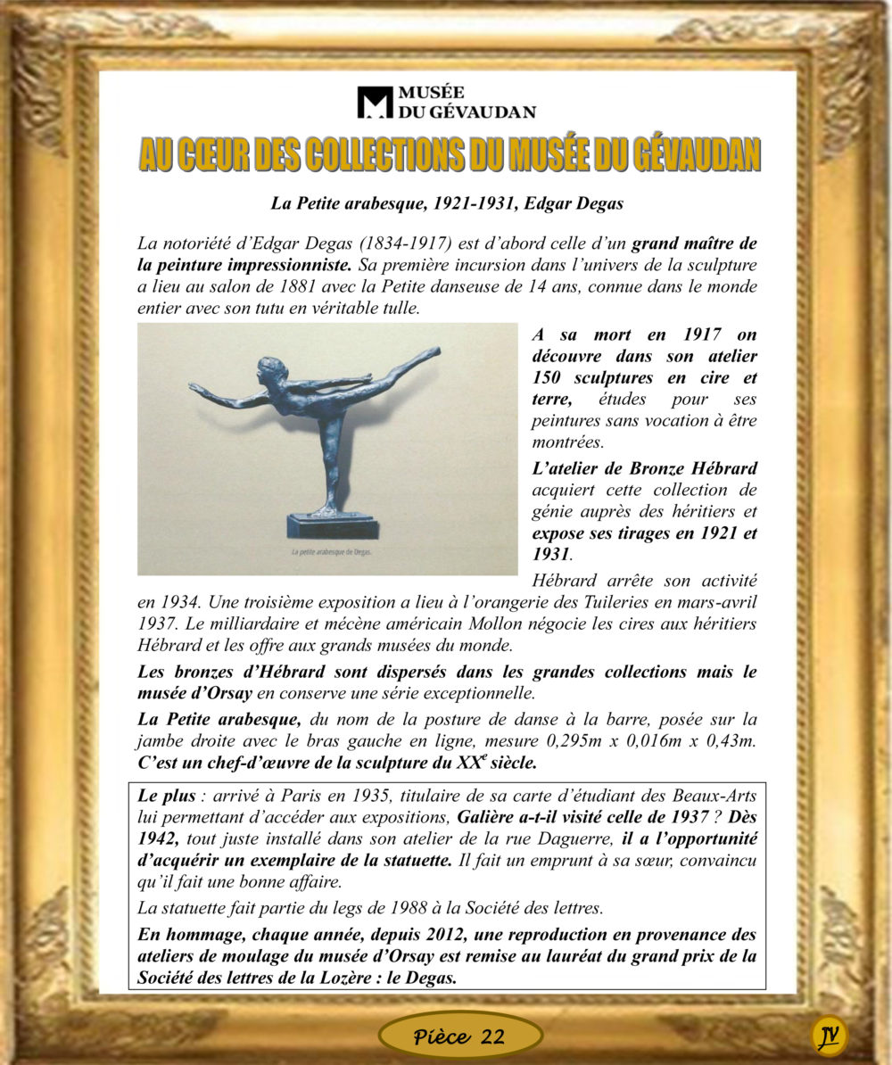 Trésors du Musée (Nos collections) 22 – La Petite arabesque, 1921-1931, Edgar Degas La notoriété d’Edgar Degas (1834-1917) est d’abord celle d’un grand maître … Vous aimerez peut-être également 20 – Le canon de bois de Charrier, 1793 96 – le florin d’or d’Urbain V, 1366 99 – L’omelette, 1982, de Jean Malice