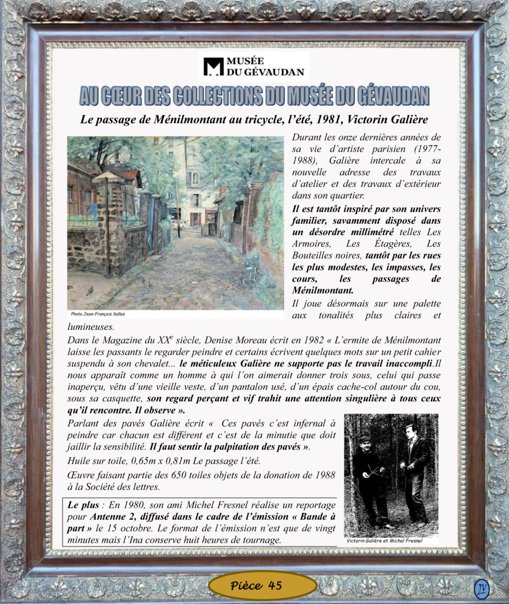 Trésors du Musée (Nos collections) 45 – Le passage de Ménilmontant au tricycle, l’été, 1981, Victorin Galière Durant les onze dernières années de sa vie d’artiste parisien Vous aimerez peut-être également 18 – Les plaques muletières, XVIe- XVIIIe siècles 42 – Mgr de Castellane, XVIIIe siècle 77 – Les deux canthares étrusques de la collection Campana, 600 ans avt. J.-C.