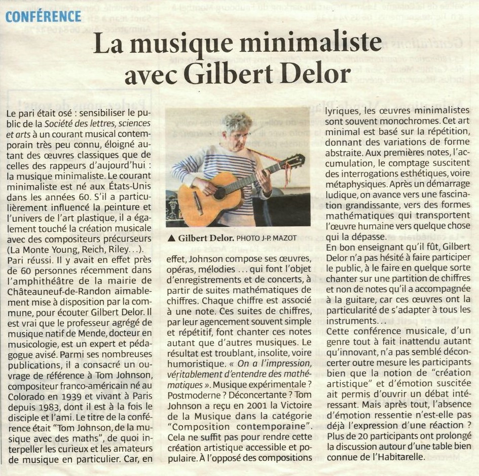 Presse Lozère Nouvelle du 3 août 2023 La musique minimaliste avec Gilbert Delor Vous aimerez peut-être également Lozère Nouvelle du 4 septembre 2025 Midi Libre du 10 juillet 2019 Lozère Nouvelle du 23 décembre 2021