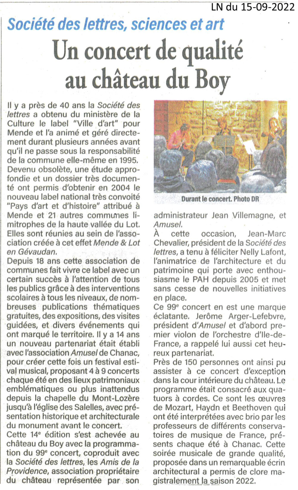 Presse Lozère Nouvelle du 15 septembre 2022 Un concert de qualité au château du Boy Vous aimerez peut-être également Midi Libre du 18 juin 2021 Midi Libre du 26 octobre 2019 Lozère nouvelle du 8 août 2019