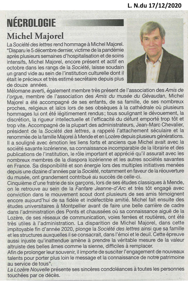 Presse Lozère Nouvelle du 17 décembre 2020 Michel Majorel Vous aimerez peut-être également Midi Libre du 10 mars 2021 Lozère Nouvelle du 21 novembre 2024 Lozère Nouvelle du 30 mai 2019