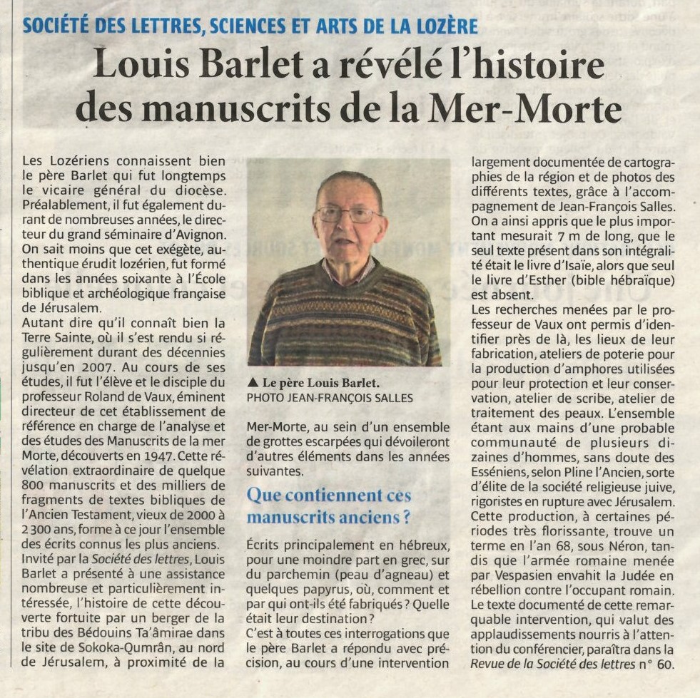 Presse Lozère Nouvelle du 3 juillet 2025 Louis Barlet a révélé l’histoire des manuscrits de la Mer Morte Vous aimerez peut-être également MidiLibre des 3,4 et 5 janvier 2020 Lozère Nouvelle du 9 janvier 2025 Lozère Nouvelle du 27 mars 2023