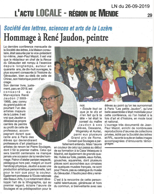 Presse Lozère Nouvelle du 26 septembre 2019 Hommage à René jaudon, peintre Vous aimerez peut-être également Midi Libre du 11 août 2019 Lozère Nouvelle du 31 octobre 2019 Midi libre du 31 août 2022