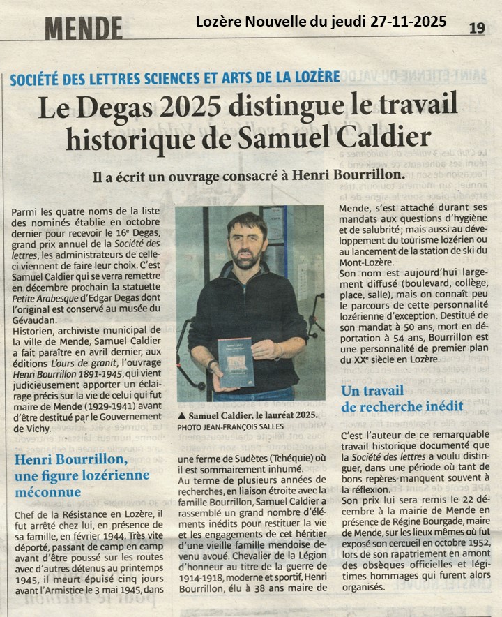 Presse Lozère Nouvelle du 27 novembre 2025 Le Degas 2025 distingue le travail historique de Samuel Caldier Vous aimerez peut-être également Lozère Nouvelle du 3 août 2023 Midi Libre du 20 septembre 2020 Lozère nouvelle du 6 avril 2023