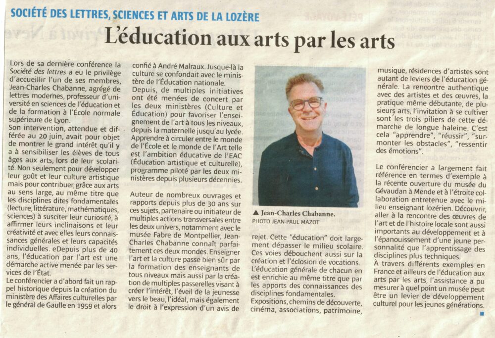 Presse Lozère Nouvelle du 4 juillet 2024 L’éducation aux arts par les arts Vous aimerez peut-être également Lozère Nouvelle du 24 décembre 2020 Midi Libre du 19 août 2020 Lozère nouvelle du 22 mai 2025