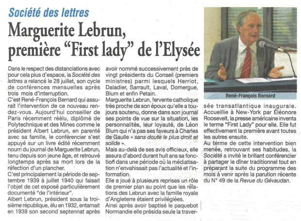 Presse Lozère Nouvelle du 6 août 2020 Marguerite Lebrun, première « First Lady » de l’Elysée Vous aimerez peut-être également Lozère Nouvelle du 24 décembre 2020 Midi Libre du 13 novembre 2020 MidiLibre des 3,4 et 5 janvier 2020