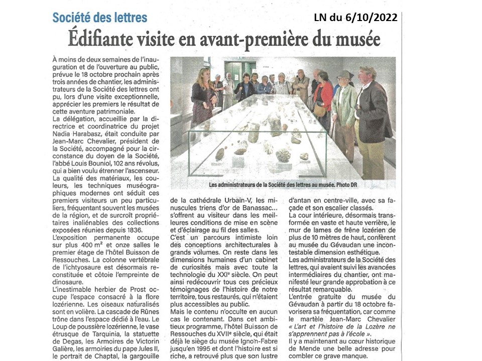 Presse Lozère Nouvelle du 6 octobre 2022 Edifiante visite en avant-première du musée Vous aimerez peut-être également Lozère Nouvelle du 12 mars 2020 Lozère Nouvelle du 8 février 2024 Lozère nouvelle du 22 mai 2025