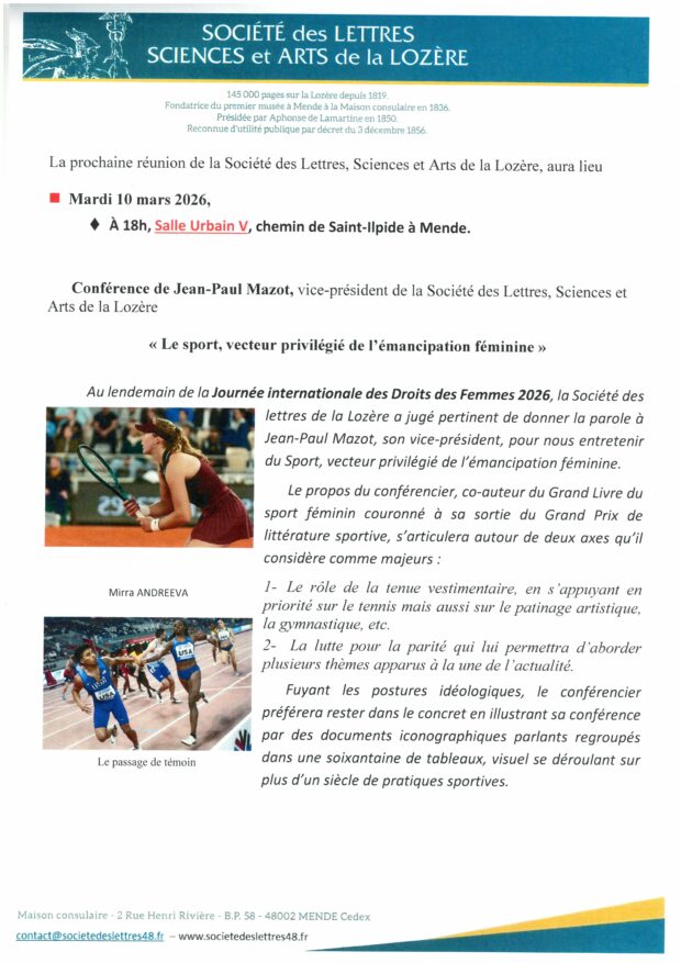 Prochainement Mardi 10 mars 2026 – » Le sport, vecteur privilégié de l’émancipation féminine » Par Jean-Paul Mazot Vous aimerez peut-être également Mardi 14 avril 2026 « Sur les épaules de Guy de Chauliac » Mardi 10 février 2026 – « L’épopée du lac de Naussac » – Il était une fois Naussac …