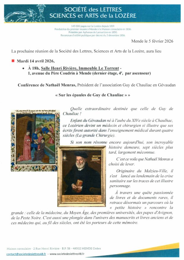 Prochainement Mardi 14 avril 2026 « Sur les épaules de Guy de Chauliac » Par Nathaël Menras Vous aimerez peut-être également Mardi 10 février 2026 – « L’épopée du lac de Naussac » – Il était une fois Naussac … Mardi 10 mars 2026 – » Le sport, vecteur privilégié de l’émancipation féminine »