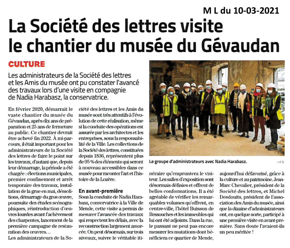 Presse Midi Libre du 10 mars 2021 La Société des lettres visite le chantier du musée du Gévaudan Vous aimerez peut-être également Midi Libre du 4 janvier 2019 Lozère Nouvelle du 2 mars 2023 Lozère Nouvelle du 17 septembre 2020