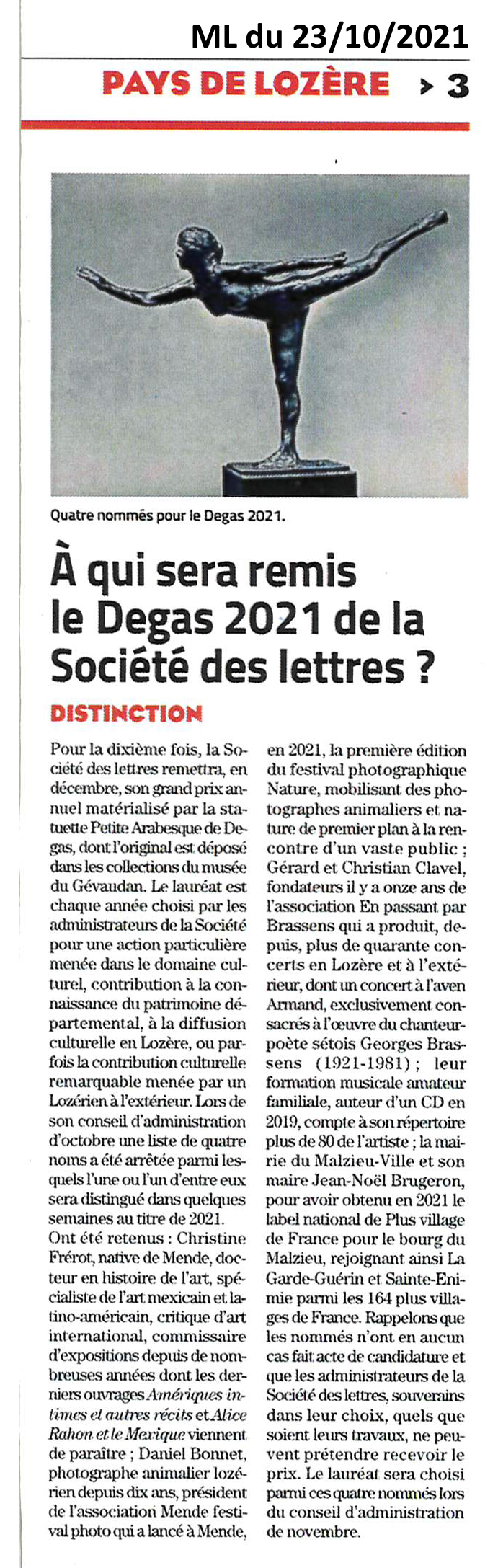 Presse Midi Libre du 23 octobre 2021 A qui sera remis le Degas 2021 de la Société des lettres ? Vous aimerez peut-être également Midi Libre du 11 août 2019 Lozère Nouvelle du 9 janvier 2025 MidiLibre des 3,4 et 5 janvier 2020