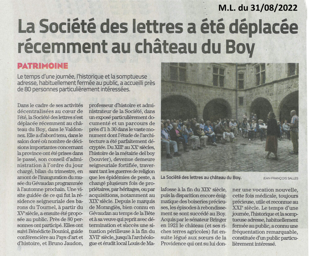Presse Midi libre du 31 août 2022 La Société des lettres en déplacement au château du Boy Vous aimerez peut-être également Lozère Nouvelle du 9 janvier 2025 Midi Libre du 23 mai 2019 Midi Libre du 29 août 2019