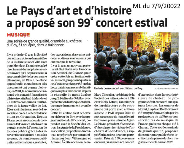 Presse Midi Libre du 7 septembre 2022 La Société des Lettres et le Pays d’art et d’histoire une vieille complicité toujours actuelle. Vous aimerez peut-être également Lozère Nouvelle du 23 novembre 2023 Lozère Nouvelle du 23 mai 2019 Lozère Nouvelle du 26 octobre