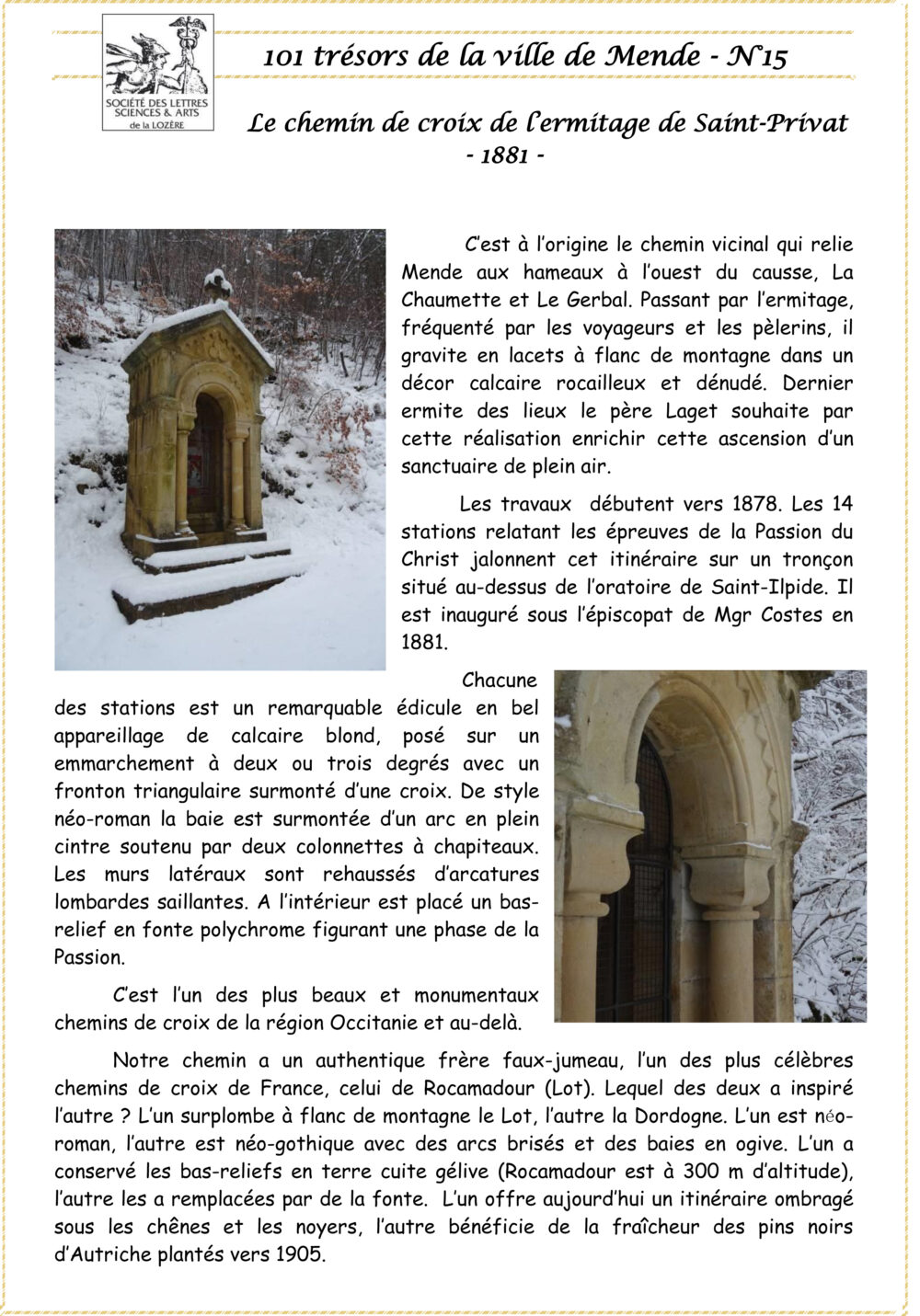 Trésors de Mende Pièce 15 – Le chemin de croix de l’ermitage de Saint Privat Vous aimerez peut-être également Pièce 10 – Le lavoir de la Calquière Pièce 88 – Les deux incunables de l’Œuvre de Guillaume Durand Pièce 63 – Les quatre visites de Saint Jean-Baptiste de la Salle