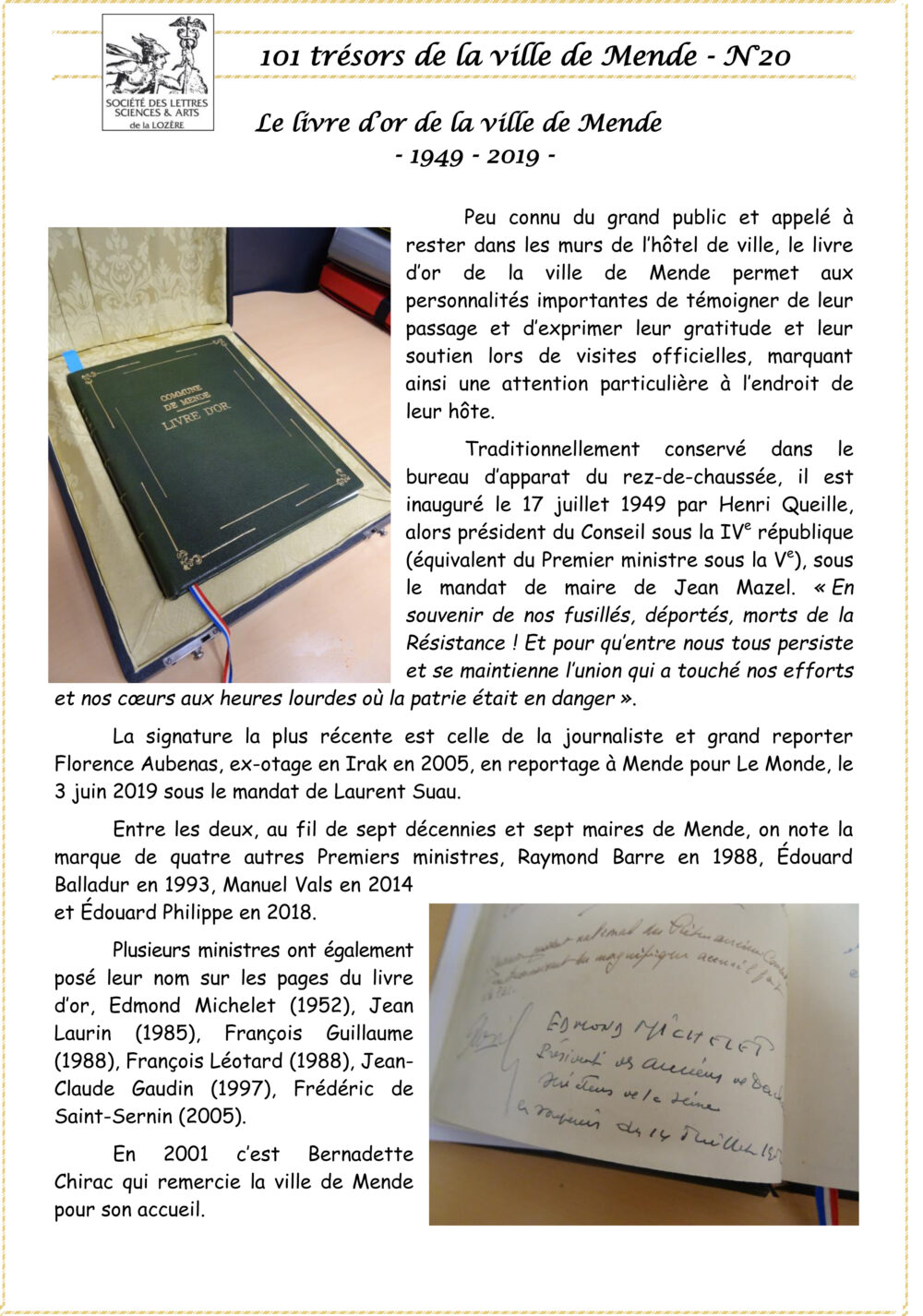 Trésors de Mende Pièce 20 – Le livre d’or de la ville de Mende – 1949 – 2019 Vous aimerez peut-être également Pièce 73 – Portes et fenêtres de la Renaissance Pièce 23 – Le collège de Toussaint Pièce 59 – Cité des anges – Deuxième épisode