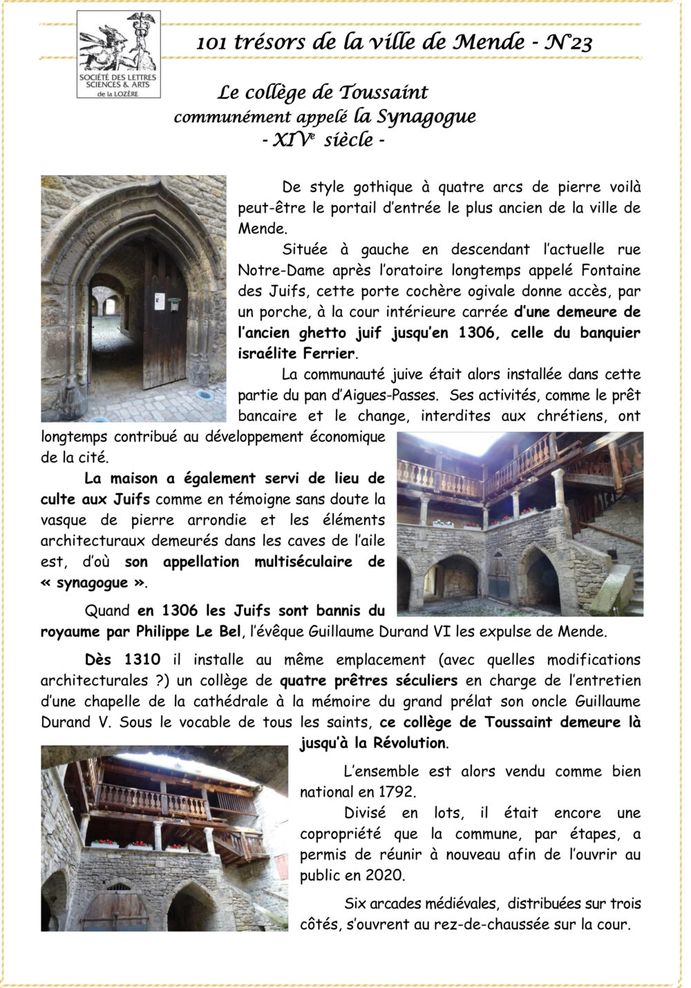 Trésors de Mende Pièce 23 – Le collège de Toussaint Vous aimerez peut-être également Pièce 37 – Le grand vitrail de l’hôtel de ville Pièce 57 – La stèle du camp des femmes de Rieucros Pièce 93 – Dix maisons à encorbellement et pans de bois