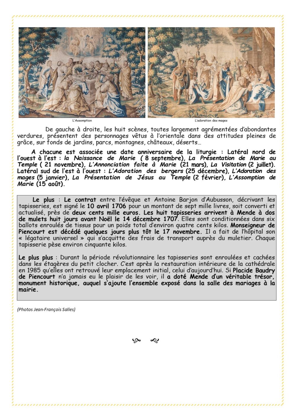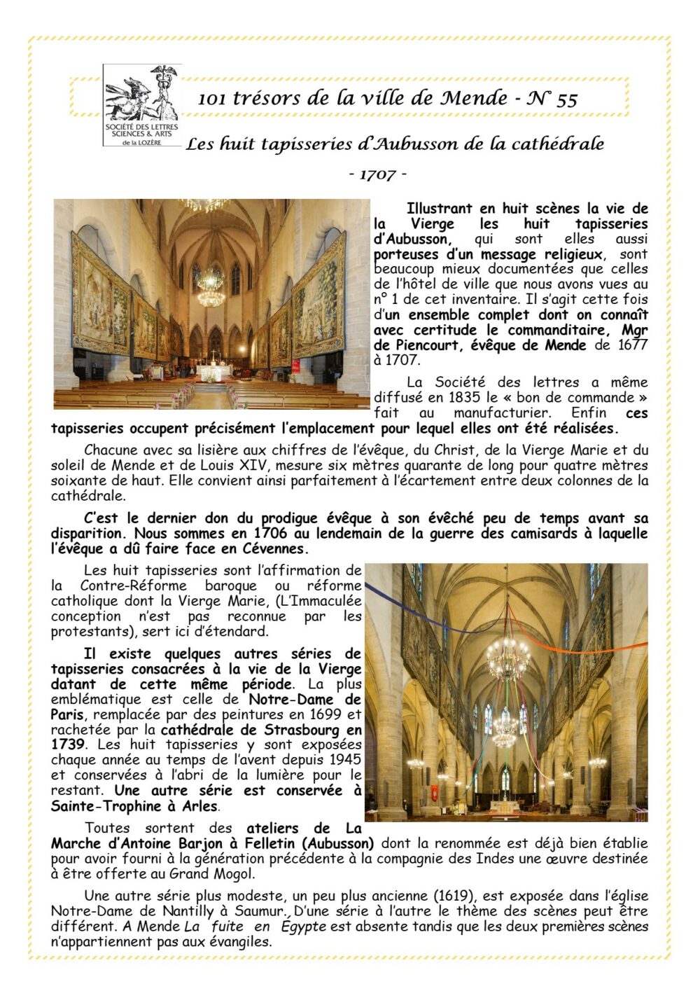 Trésors de Mende Pièce 55 – Les huit tapisseries d’Aubusson à la cathédrale Vous aimerez peut-être également Pièce 37 – Le grand vitrail de l’hôtel de ville Pièce 70 – Les grandes orgues de la cathédrale Pièce 62 – La fontaine du foirail