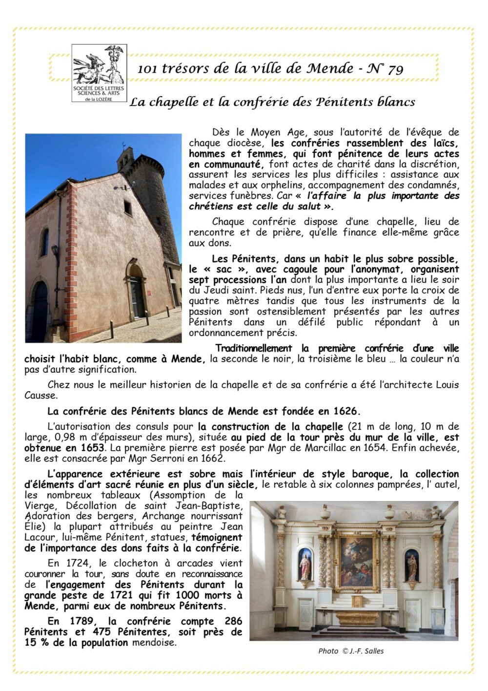 Trésors de Mende Pièce 79 – La chapelle et la confrérie des Pénitents blancs Vous aimerez peut-être également Pièce 48 – Trois devantures et six commerces centenaires Pièce 1 – Les 6 tapisseries d’Aubusson de l’hôtel de ville Pièce 3 – Le Trésor de Mandrin