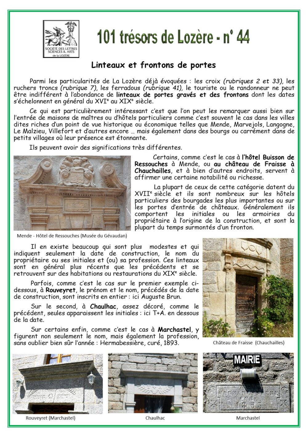 Trésors de Lozère Rubrique N° 44 – Linteaux et frontons de portes Vous aimerez peut-être également Rubrique 65 – Javols, autrefois Anderitum, la capitale des Gabales Rubrique 33 – Croix dites à bubons & croix en fer forgé Rubrique 69 – Les massifs forestiers