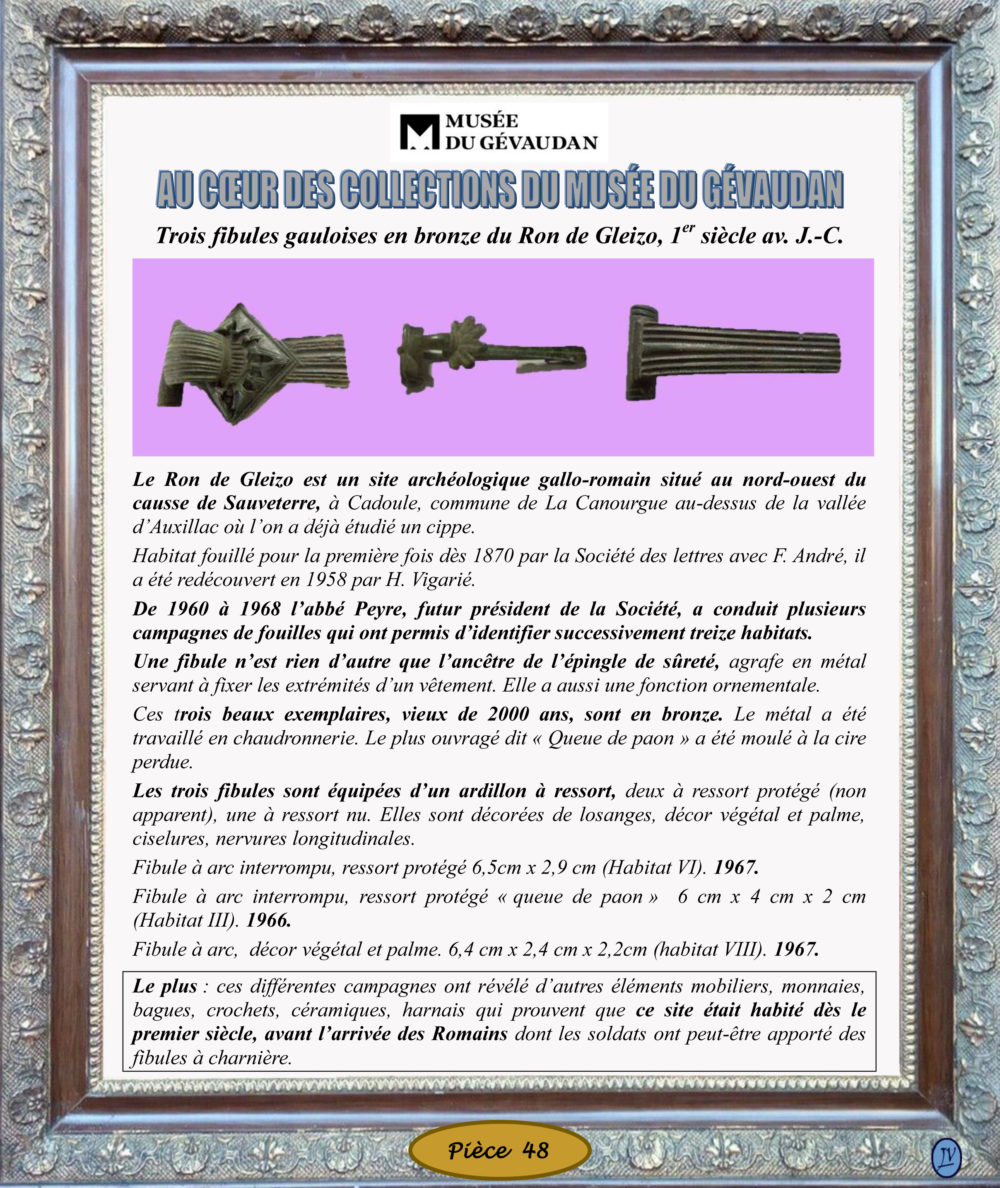 Trésors du Musée (Nos collections) 48 – Trois fibules gauloises en bronze du Ron de Gleizo, 1er siècle av. J.-C. Le Ronde Gleizo est un site archéologique gallo-romain Vous aimerez peut-être également 77 – Les deux canthares étrusques de la collection Campana, 600 ans avt. J.-C. 24 – Portrait de S.A.R. le duc Ferdinand d’Orléans, 1842 98 – Les coupes funéraires du Freycinel, 1000 ans avant J.-C.